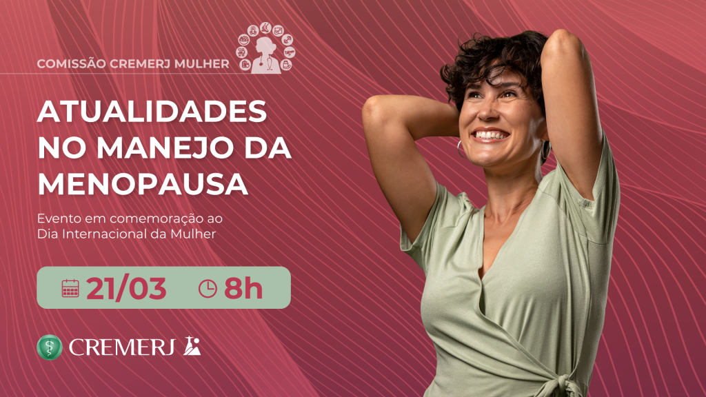 O Conselho Regional de Medicina do Estado do Rio de Janeiro, por meio da Comissão CREMERJ Mulher, tem a honra de convidá-lo (a) para participar do Evento “Atualidades no Manejo da Menopausa”, em Comemoração ao Dia Internacional da Mulher, a ser realizado no dia 21 de março de 2026, sábado, a partir das 8h, no Auditório do CREMERJ Julio Sanderson. O evento é destinado a Médicos e Estudantes de Medicina do Estado do Rio de Janeiro e será transmitido ao vivo pelo canal do Youtube do CREMERJ.