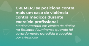 O CREMERJ se posiciona contra mais um caso de violência durante o exercício profissional. A médica estava atendendo em uma clínica de diálise, situada na Baixada Fluminense, no início desta semana, quando foi ameaçada, agredida e coagida por um criminoso. O Conselho manifesta repúdio em relação ao ocorrido e expressa solidariedade à profissional, a seus colegas de trabalho e a todos os médicos do estado do Rio de Janeiro, que, infelizmente, sentem-se cada vez mais ameaçados com a prática da violência nas unidades de saúde.
