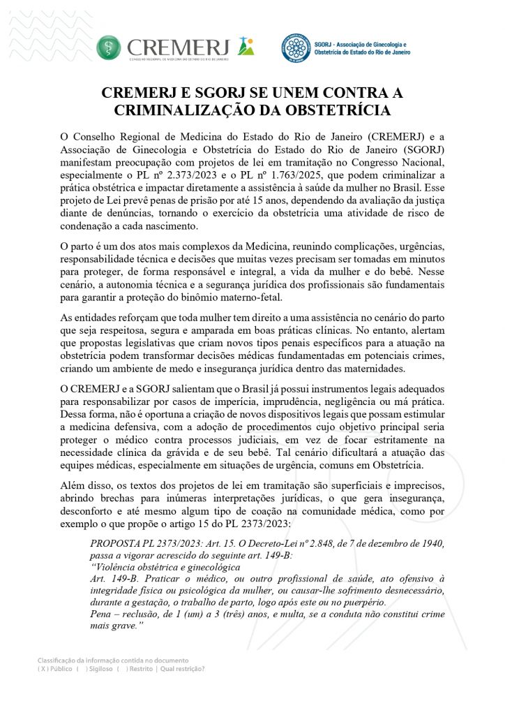 O Conselho Regional de Medicina do Estado do Rio de Janeiro (CREMERJ) e a Associação de Ginecologia e Obstetrícia do Estado do Rio de Janeiro (SGORJ) manifestam preocupação com projetos de lei em tramitação no Congresso Nacional, especialmente o PL nº 2.373/2023 e o PL nº 1.763/2025, que podem criminalizar a prática obstétrica e impactar diretamente a assistência à saúde da mulher no Brasil. Esse projeto de Lei prevê penas de prisão por até 15 anos, dependendo da avaliação da justiça diante de denúncias, tornando o exercício da obstetrícia uma atividade de risco de condenação a cada nascimento.